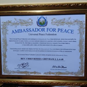 The Universal Peace Federation’s Ambassador for Peace award is given to individuals who exemplify the values of peace, compassion, and service to humanity.