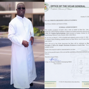 According to a funeral announcement from the Office of the Vicar General, signed by V. Rev. Fr. George Owoahene Acheampong Marfo, a Mass will be held in honor of the late priest on Monday, November 3, 2025, at 8 am at St. Joseph’s Rectorate, Kromoase.