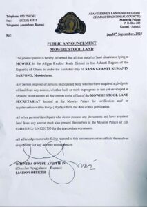 The Asantehene’s Lands Secretariat has issued a public announcement regarding lands in the Mowire Stool area, located in the Afigya Kwabre South District of Ghana’s Ashanti Region.